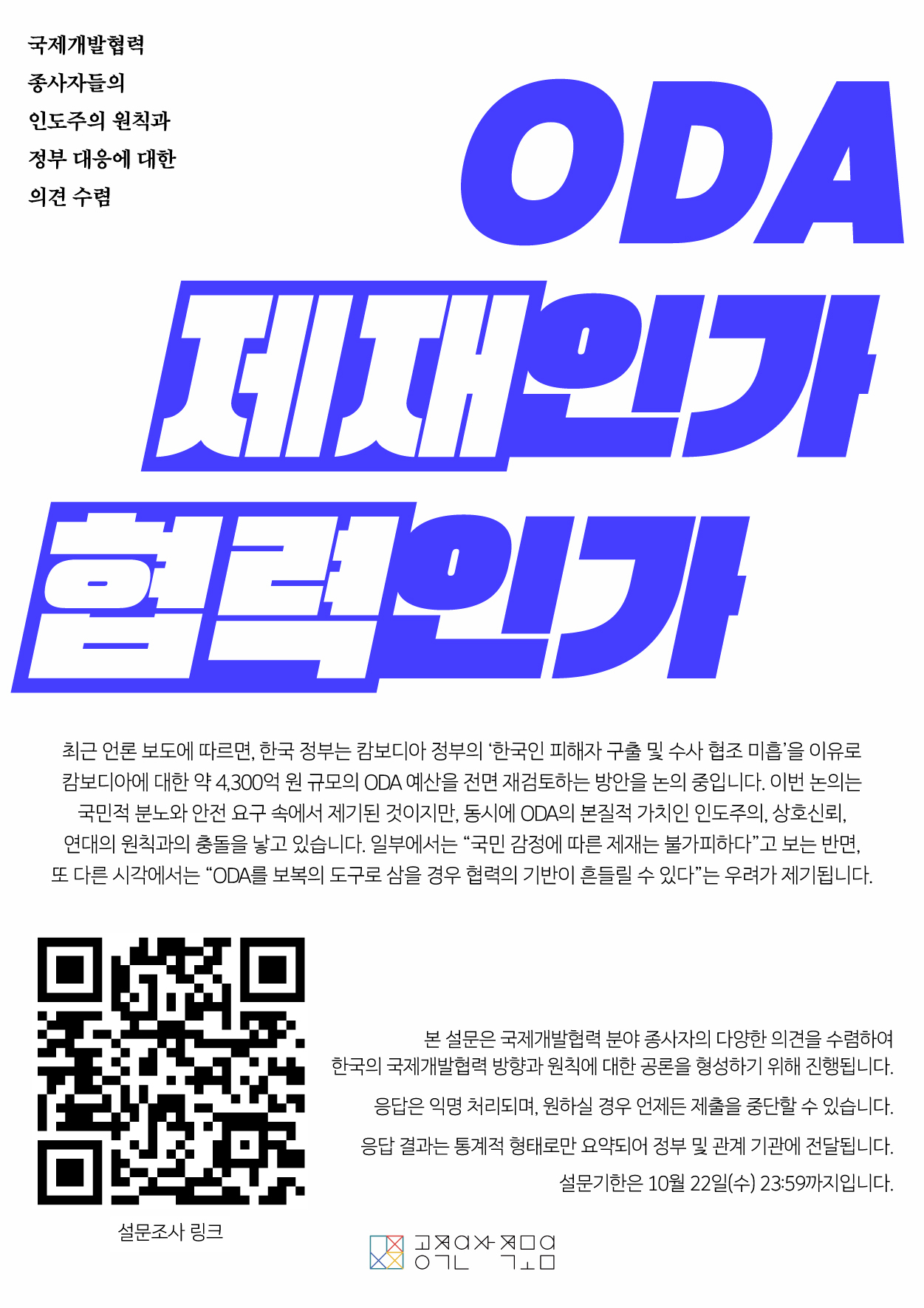 ์บ๋ณด๋์์์ ๋ฐ์ํ ํด์ธ ์ทจ์ ์ฌ๊ธฐ ์ฌ๊ฑด ์ดํ, ์ ๋ถ๋ ODA ์ค๋จ์ ํฌํจํ ๋์์ฑ ์ ๊ฒํ ์ค์ ๋๋ค. ํ์ง๋ง ODA๋ ์ ์ฌ์ ์๋จ์ด ์๋๋ผ ํ๋ ฅ๊ณผ ์ธ๋์ฃผ์์ ์์น์ ๊ธฐ๋ฐํ ๊ตญ์ ์ ์ฑ ์ ๋๋ค. ๊ณต์ ์ธ์ฌ์ ๋ชจ์์ ์ด๋ฒ ์ฌ์์ ๋๋ฌ์ผ ์ ๋ถ์ ๋์๊ณผ ๊ตญ์ ๊ฐ๋ฐํ๋ ฅ์ ์์น์ ๋ถ์ผ ์ข ์ฌ์ ๋ฐ ์ ๋ฌธ๊ฐ๋ค๊ณผ ํจ๊ป ๋ ผ์ํ๊ธฐ ์ํด ์จ๋ผ์ธ ๊ธด๊ธ ํ ๋ก ํ๋ฅผ ์ฝ๋๋ค. ํ ๋ก ํ ๋ด์ฉ์ ํ์ฌ ์งํ์ค์ธ ์ค๋ฌธ์กฐ์ฌ ๊ฒฐ๊ณผ์ ํจ๊ป ์ทจํฉํ์ฌ ์ ๋ถ ๋ฐ ๊ด๊ณ ๊ธฐ๊ด์ ์ ๋ฌํ ์์ ์ ๋๋ค.