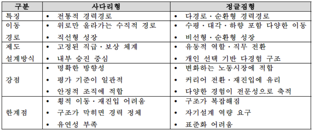 ๊ทธ๋ ๋ค๋ฉด ๋์์ ๋ฌด์์ผ๊น์? ์ฐ๊ตฌ๋ฅผ ํตํด ๋์ถํ ๊ฒฐ๋ก ์ โ์ฌ๋ค๋ฆฌํ(ladder)โ ๊ฒฝ๋ ฅ ๋ชจ๋ธ์์ โ์ ๊ธ์งํ(jungle gym)โ ๊ฒฝ๋ ฅ ๋ชจ๋ธ๋ก์ ์ ํ์