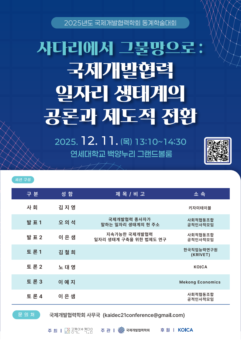 [2025 ๊ตญ์ ๊ฐ๋ฐํ๋ ฅํํ ๋๊ณํ์ ๋ํ] "์ฌ๋ค๋ฆฌ์์ ๊ทธ๋ฌผ๋ง์ผ๋ก: ๊ตญ์ ๊ฐ๋ฐํ๋ ฅ ์ผ์๋ฆฌ ์ํ๊ณ์ ๊ณต๋ก ๊ณผ ์ ๋์ ์ ํ" (12/11) |