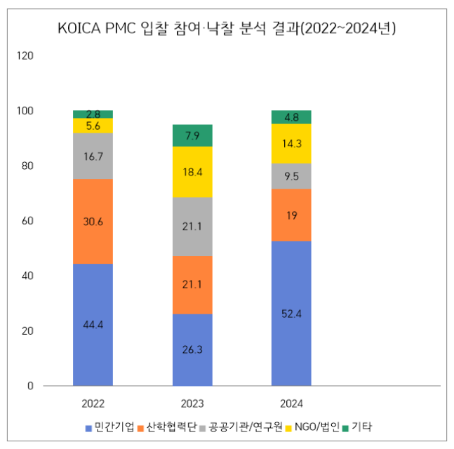 KOICA 전자조달시스템에서 지난 3년간 발주된 PMC를 분석한 결과, 대형 민간 컨설팅사, 대학 산학협력단, 일부 공공·연구기관이 대부분의 사업을 가져가고 있다는 사실이 드러났습니다. 특히 민간기업은 해마다 전체 낙찰 건수의 40~50%를 차지하며 금액 비중도 35~40% 내외를 유지해 가장 주도적인 위치를 점하고 있었죠. 디지털 ODA와 기술 분야 확장 흐름 속에서 엔지니어링 기업들의 입지도 더욱 공고해지고 있습니다. 반면, 소규모 기관·신생 조직·지역 기반 단체는 통계상 거의 보이지 않을 정도이며, 수주 경험이 없는 기관은 첫 번째 프로젝트로 접근할 길조차 찾기 어렵습니다. |